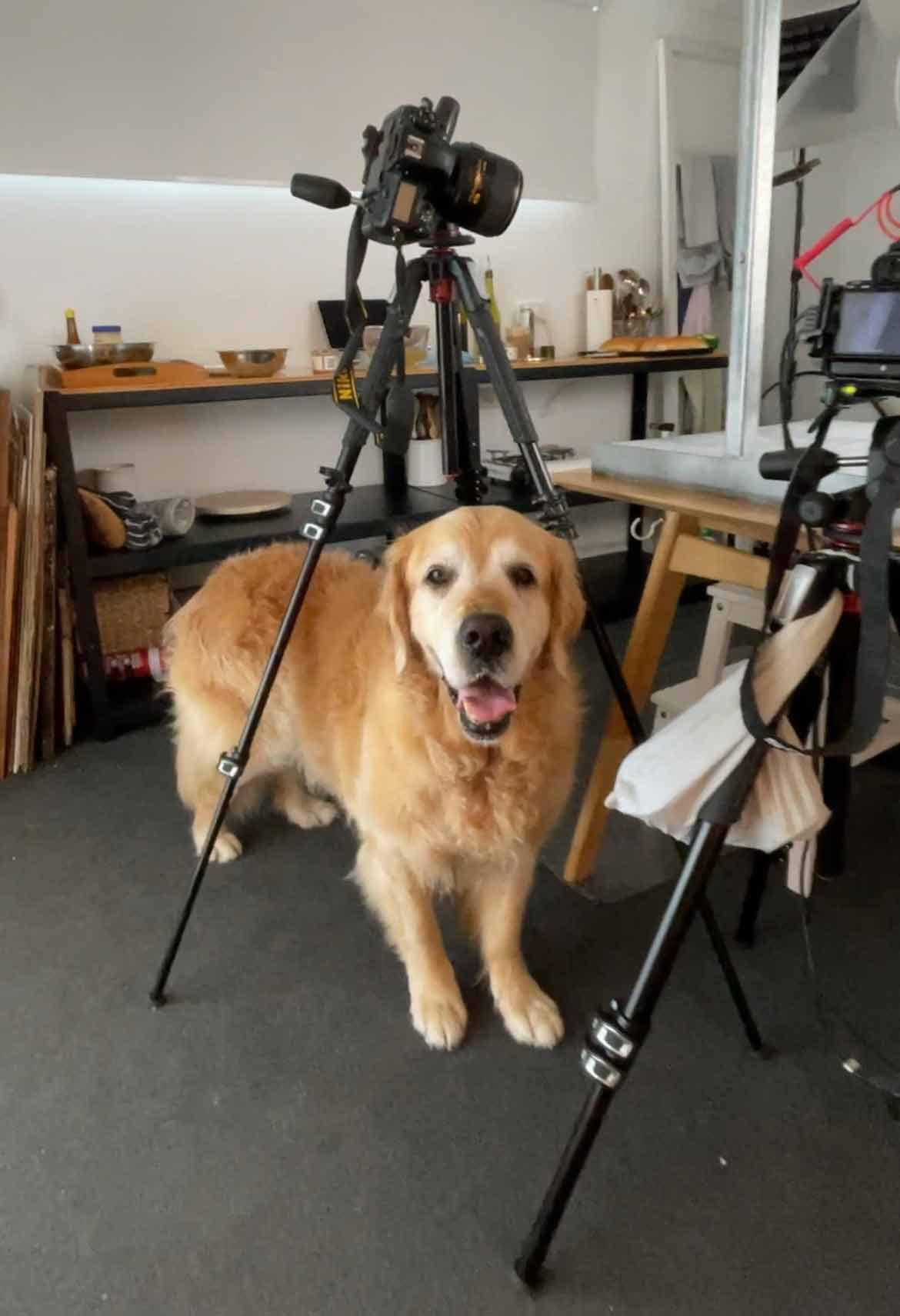 And a look-back on Dozer’s past 11 years would not be complete without snippets of his life on the job! Squeezing himself under tables laden with food I’m photographing……particularly alarming given his size. If he lifted his head, those meatballs would go flying!!