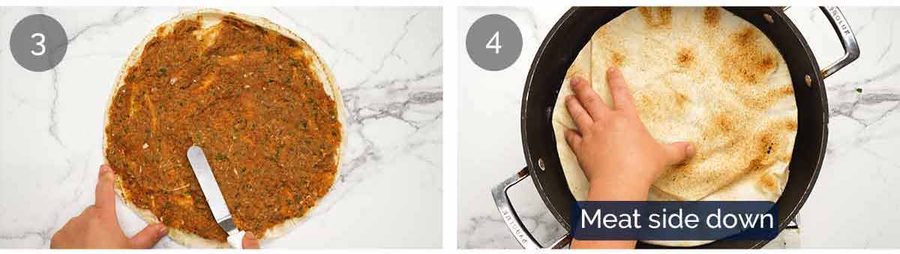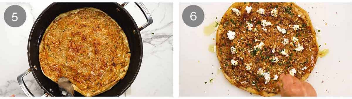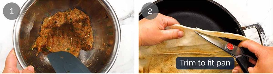 - Use a large 30cm/12" non-stick pan. If needed, use scissors to cut one side of the Lebanese bread so it fits in your pan (Note 4)