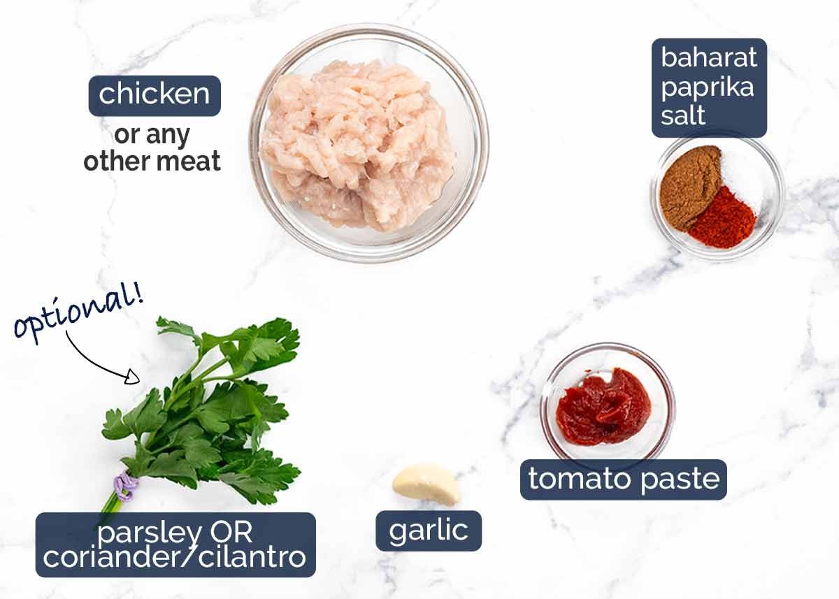 Here’s what you need for the meat topping. The recipe was born on a day I was trying to think of interesting ways to use chicken mince, so that’s what I’ve used. It’s delicious as is, and I’m glad to have another great chicken mince recipe in my arsenal, but frankly, even better with fattier meats – lamb or beef.