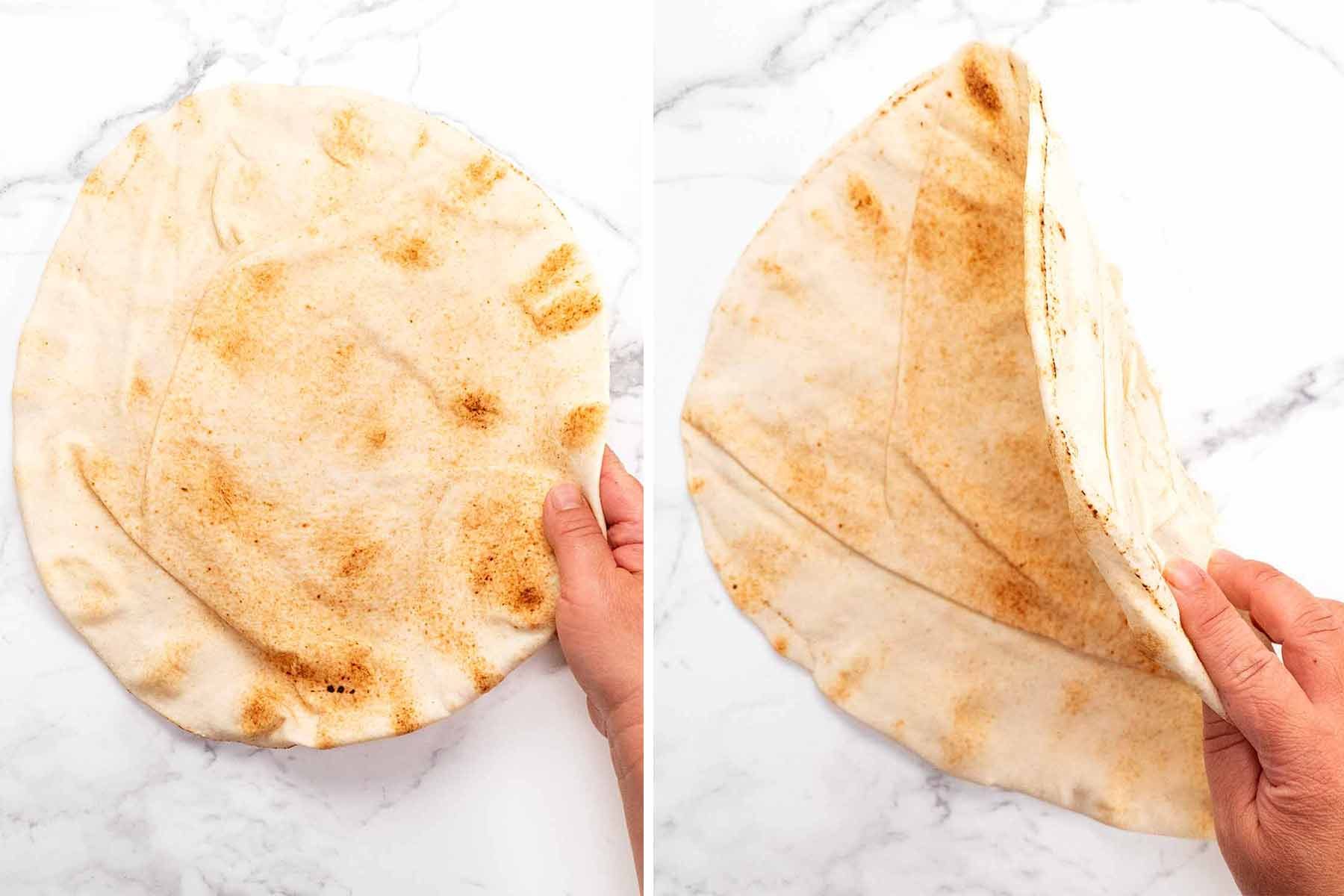 Are you familiar with this large pita bread? It’s a staple at every grocery store here in Australia! Don’t worry if you can’t get it. This recipe will work with any flatbread. Or even tortillas!