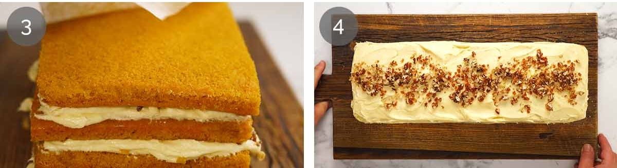- Cut – Invert a piece of cake onto a cutting board. Cut in half lengthways. Trim as needed for level, even layers. Cover each piece of cake with its own sheet of baking paper (trimmed to size), with overhang for ease of handling.