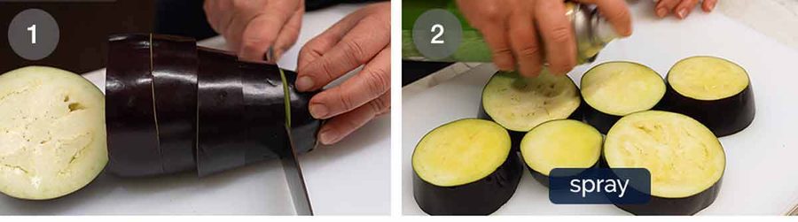Oil spray – This is the best way to get oil coverage using very little oil. I tried to measure it out and I used less than ½ teaspoon oil across 8 slices of eggplant, spraying generously. I like using olive oil spray because it has better flavour.
