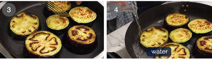Pan-steam – Quickly put the lid on to trap the steam to cook the eggplant. Leave it for 2 minutes or until the water has evaporated.