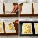 - Cut the puff pastry in half. Use a knife to score a 1cm / 1/3" border (see photo below). (Note 1) Transfer to baking tray.
