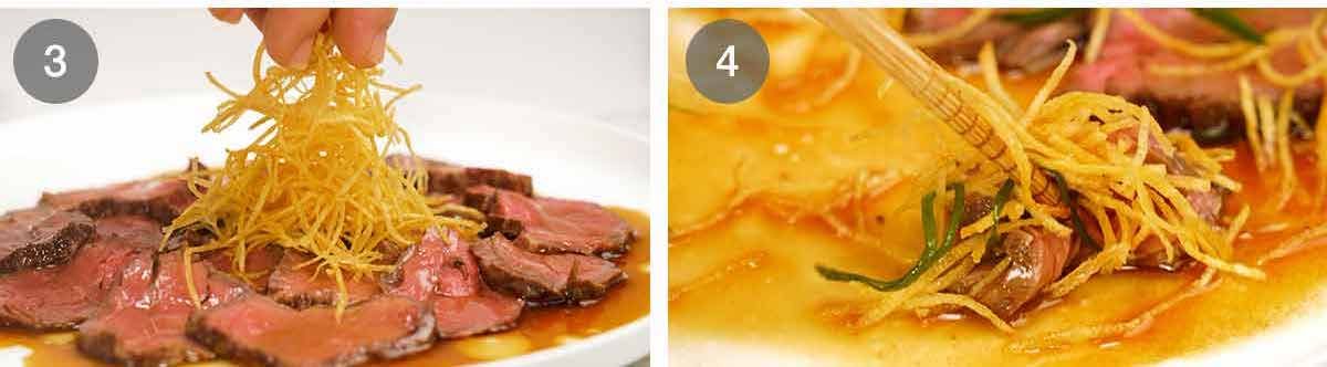 A crunchy garnish always works well with these sort of dishes, to add texture contrast. For the restaurant-style beef tataki option, I’m using Crispy Potato Straws (blatant copycat from tataki I’ve had at restaurants). These superfine fries are the perfect garnish because they are delicately crisp and you can pile them up high so they add visual interest.