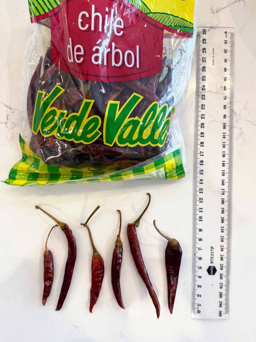 - 6 g (0.2 oz) chillies de arbol, dried (~6 pieces, 2 tbsp once chopped) (Note 1)