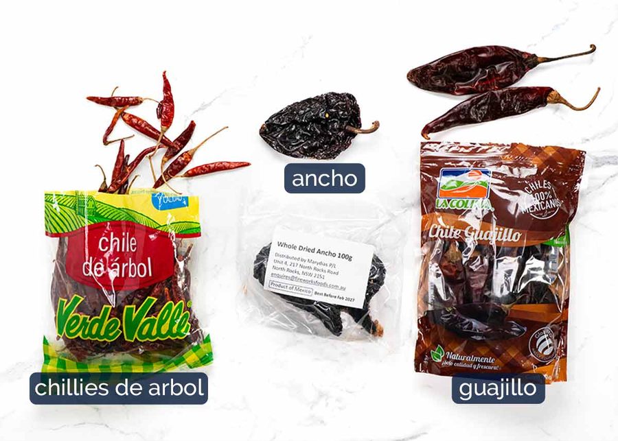 Where to buy – Fellow Sydneysiders can find dried Mexican chillies at Mexican/Latin or well-stocked international grocers like Top Ryde Growers (my local). You can also buy them online at Fireworks food and Chile Mojo* (Australia), else readers can find chillies on Amazon: guajillo (AU|UK|US); ancho (AU|UK|US); chiles de arbol (AU|UK|US).