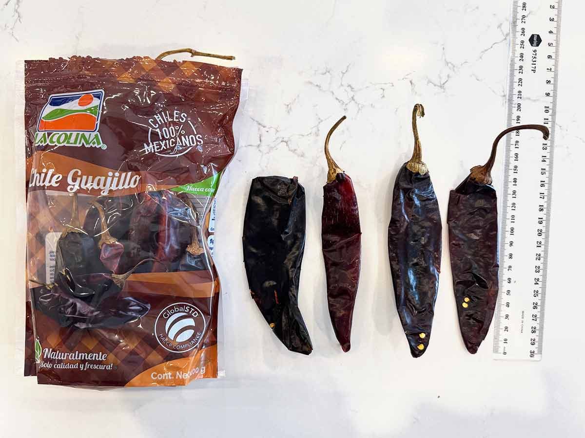 - 25 g (0.9 oz) guajillo chillies, dried (~4 pieces, heaped 3/4 cup once chopped) (Note 1)