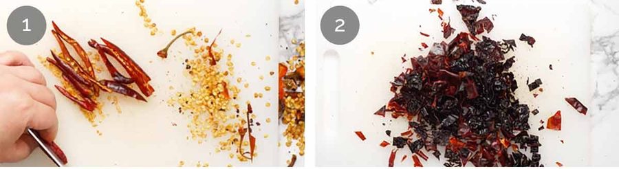Deseed the chillies by cutting them in half lengthways and tapping/scraping out the seeds. Also trim off and discard tough stems. We remove the seeds because they are spicy and also because we don’t want gritty bits in our braise. (A few random seeds left is ok, just get rid of 98% of them).
