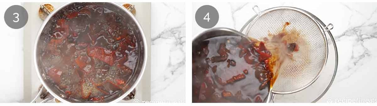 - Reserve 1/2 cup of chilli-simmering water. Drain chilli in a sieve, lightly press out residual liquid.