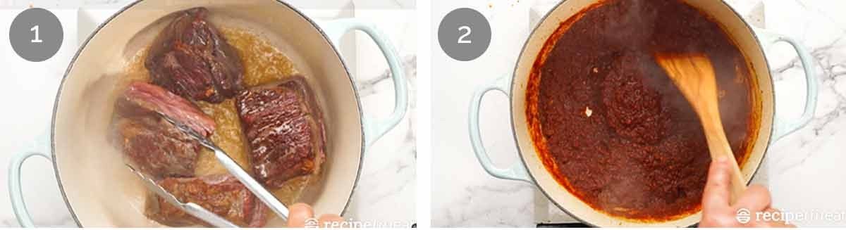 Sear beef – Heat the oil in a large heavy based pot over high heat then sear half the beef aggressively to brown it well on all sides, about 5 minutes. Remove and brown the remaining beef.