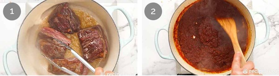 - Sear beef – Heat the oil in a large heavy based pot over high heat (I use my 24cm / 9.6" dutch oven). Add half the beef and sear each side aggressively until it's dark golden brown (about 1 – 1 1/2 minutes each side). Remove to a bowl and repeat with remaining beef.