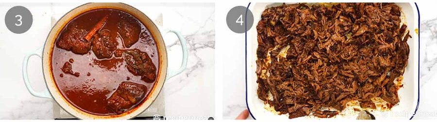 Shred and season – Remove the beef from the Birria Consommé into a shallow pan and shred well using forks. Sprinkle with salt and toss.