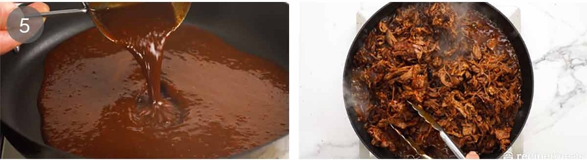 - Soak beef – Pour 1 cup of the braising liquid ("Birria Consommé") into a large non-stick pan over medium-high heat. Let it simmer for 15 seconds, then add all the beef and toss in the sauce until it's all absorbed by the beef, there should be almost none pooled in the pan. Move beef back into the shredding pan, scraping the non-stick pan clean.