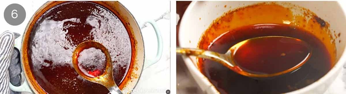 - Birria oil – Skim off as much of the red oil floating on braising liquid surface as possible (ideally 6 tbsp+) and place in a separate bowl (this is the "Birria Oil"). Precious stuff!