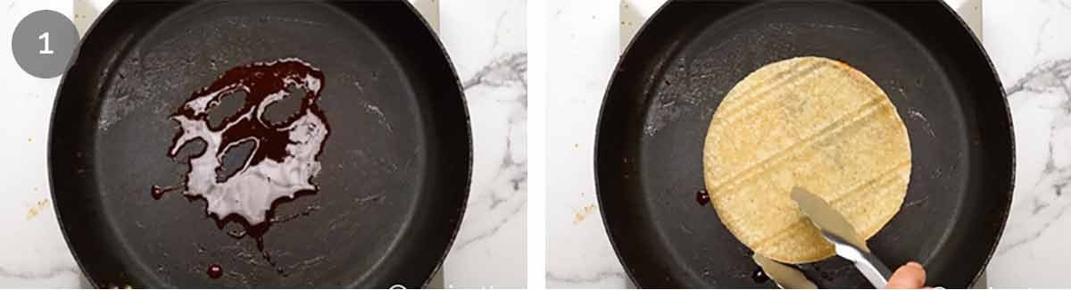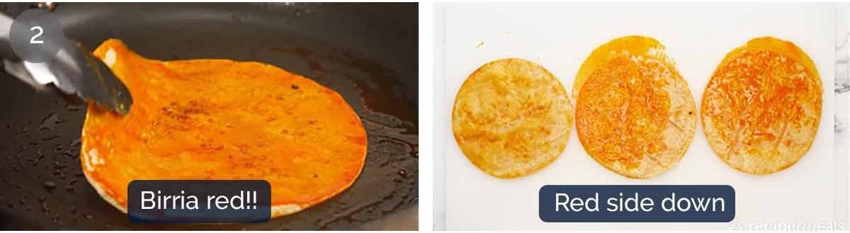 - Red tortillas – Heat 1 teaspoon Birria Oil in the same non-stick pan over medium-low heat. Put a tortilla in and "wipe" around to make the underside red. Once the tortilla is soft (no need to flip) – about 10 seconds – remove to a work surface red side down. Repeat twice more, heating 1/2 teaspoon Birria Oil for each tortilla.