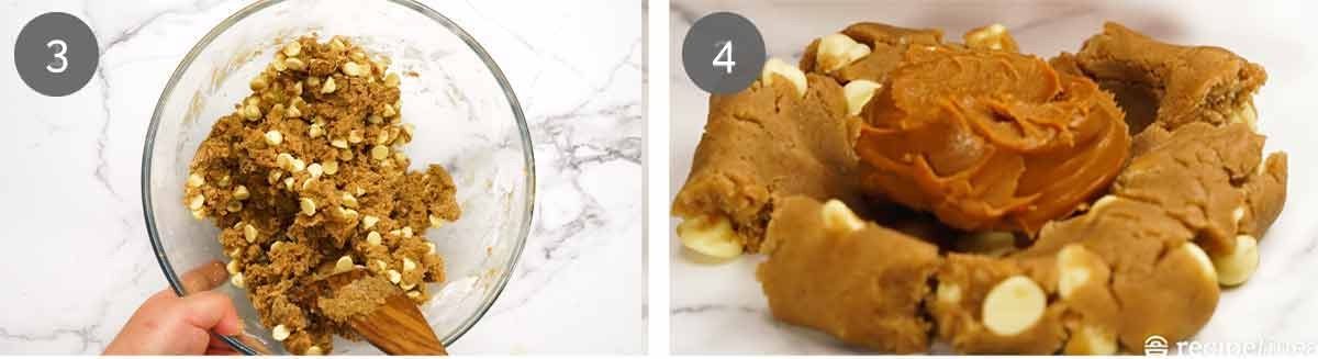 Stuff – Divide the dough into 8 portions (125g / 4.4 oz each, just under 1/2 cup). Press together into a dough then flatten with a dent and put a Biscoff disc in the middle.