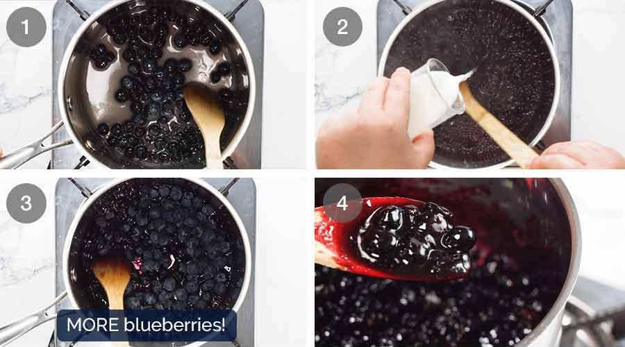 - Place 1 cup of blueberries (125g/4oz), vanilla, sugar and lemon juice in a saucepan. Stir then bring to simmer over medium heat. Simmer for 7 minutes until blueberries breakdown.