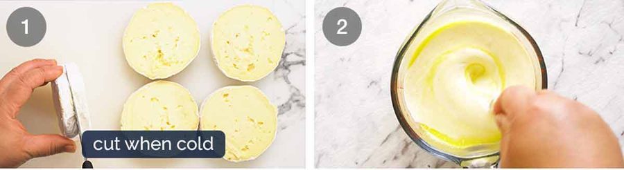 - 3 x 125g / 4oz small brie (8cm / 3.2" wide) , fridge cold, cut in half horizontally (or camembert) (Note 4)