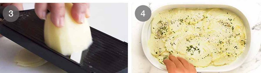 - Slice potatoes: Peel the potatoes and slice them 1/8"/3 mm thick. Or use a slicer!