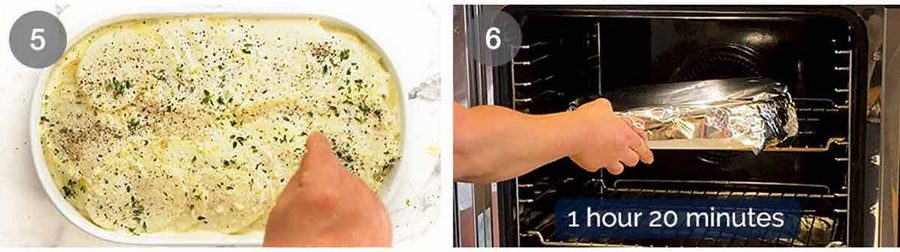 Cover with foil and bake for 1 hour 20 minutes or until the potatoes are basically done ie. soft (use a butter knife to test in the centre).