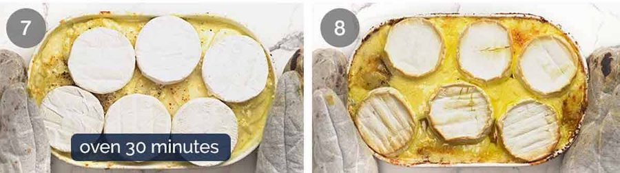 I know that sounds like a long time, and yours might be faster especially if you use a larger baking dish so the potatoes are not stacked as deep as mine. But for me, it consistently takes 80 minutes! The potatoes won’t get much softer during the 30 minute brie melting time, they just enjoy bubbling away in the melty brie.