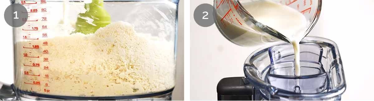 Milk – Slowly pour the milk through the feeder tube while pulsing 8 to 10 times, until you can no longer see flour, then stop pulsing