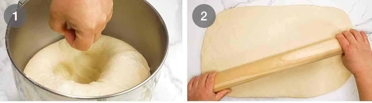 - Rise #1 – Shape the dough into a ball then put it back in the bowl. Cover with cling wrap. Let it rise in a warm place for 1 1/2 hours or until it doubles in size (see steps in post for more guidance).