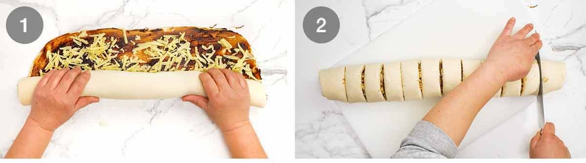 - Cut – Roll up into a log then cut into 12 even pieces.