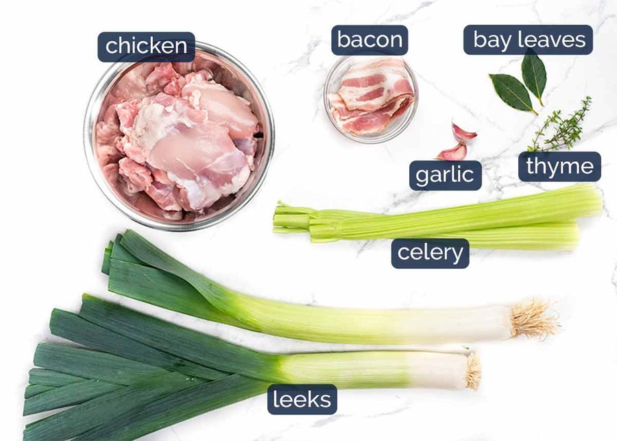 - Sear surface of chicken in half butter, remove. Cook bacon 1 minute, then leek, celery and garlic 5 minutes. Deglaze with wine, melt remaining butter, then cook flour 1 minute. Add stock, then remaining Filling ingredients. Add chicken, thicken sauce (~5 minutes).