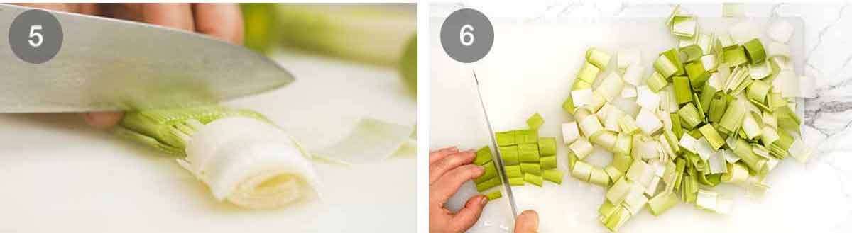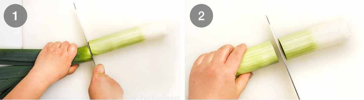 Trim off the root and the dark green part of the leek. This part is reedy and not pleasant to eat. Discard or clean then add to your homemade vegetable stock.