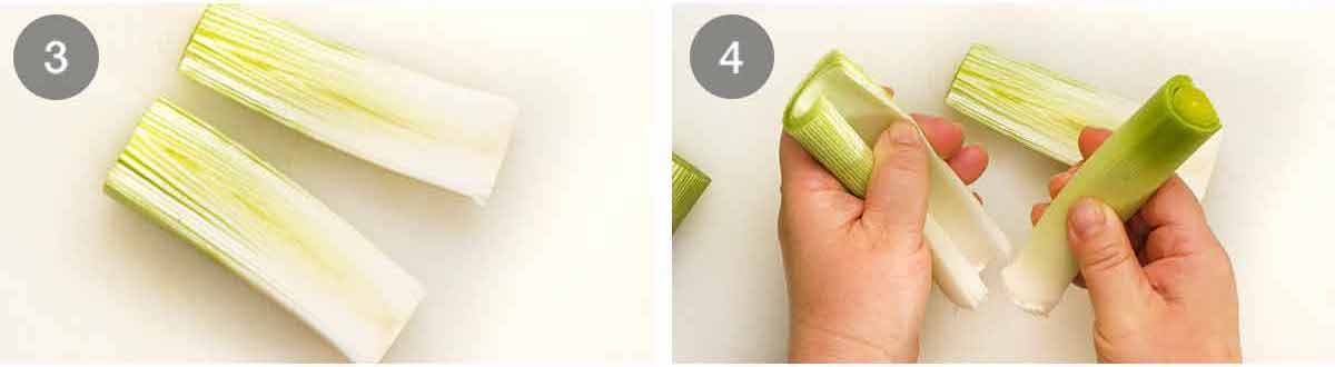 Cut the leek in half through the middle. Just to make it shorter which is easier to cut in half lengthways (next step).