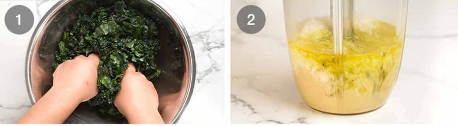 - Soften kale – Rub/scrunch the kale with the oil, salt and pepper in a large bowl. Put the kale in a large bowl then drizzle with the oil and add the salt and pepper. Set aside for 20 minutes (softens leaves).