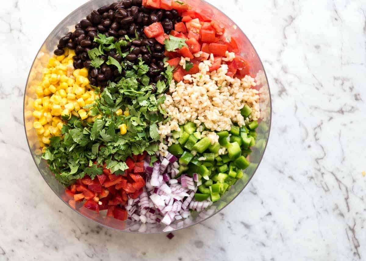 This is the first rice salad I’ve shared here on RecipeTin Eats. (Update: And in 2020, I shared another!) So I wanted to start off with a bang – and this Cowboy Rice Salad is a ripper! It’s a rice salad version of Cowboy Bean Salad which is also known as Cowboy Caviar, a Midwestern salsa/salad that’s popular in the States. Made with tomatoes, capsicum / bell peppers, red onion, corn, beans and coriander/cilantro, Cowboy Caviar is dressed with a fairly sweet vinaigrette then served as a salad or salsa for scooping up with corn chips.
