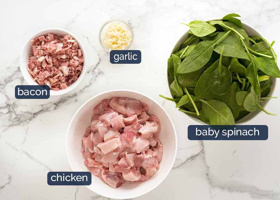 Chicken, bacon and spinach (per video below) – 500g/1.2lb chicken thigh or breast, 200g/7oz bacon chopped, 120g/4oz baby spinach