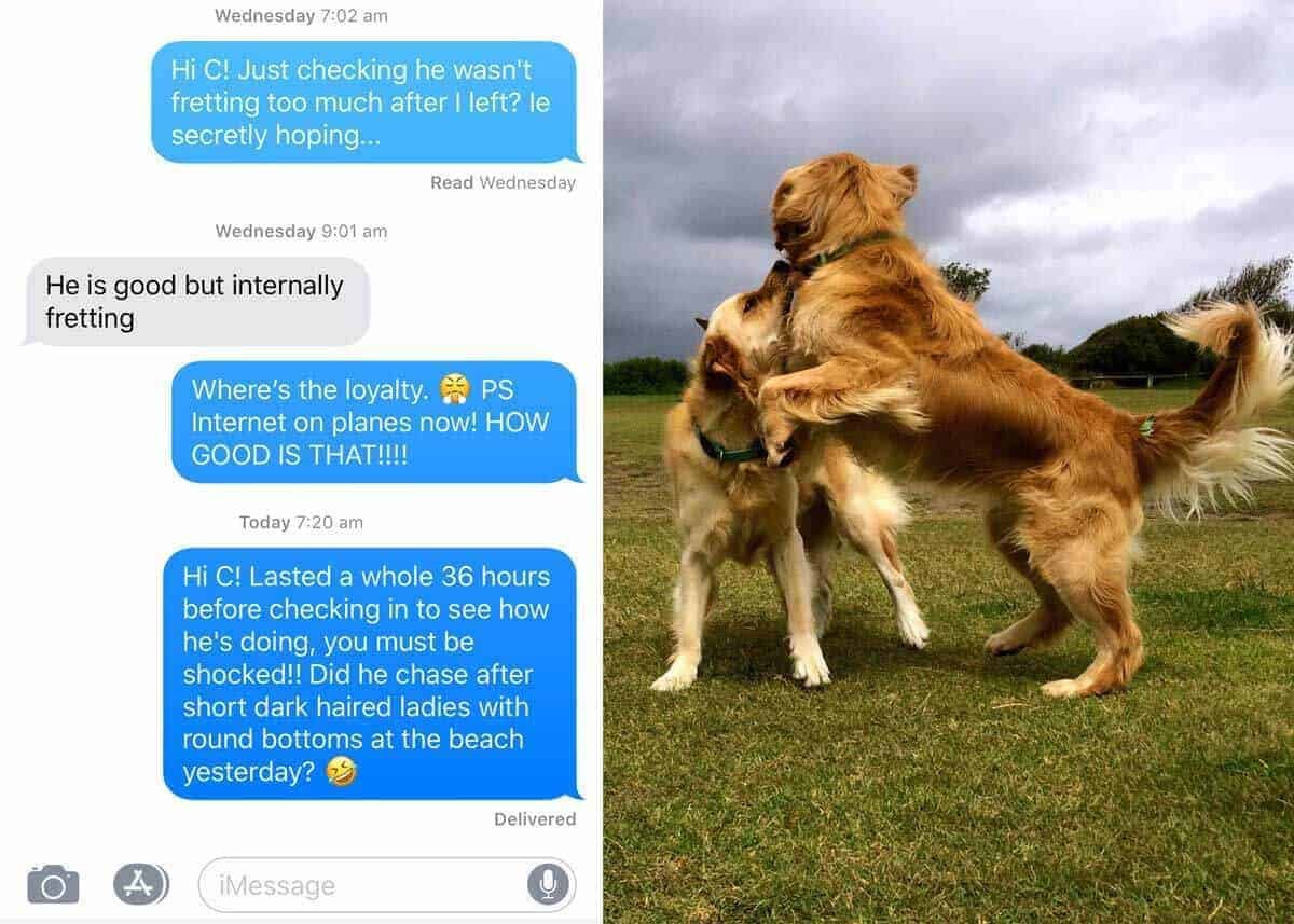 When I travel, Dozer stays with a golden retriever boarder. Rumbling with his friends, a whirlwind of fur chasing each other around the backyard, somersaulting across the lounge room as they tumble.