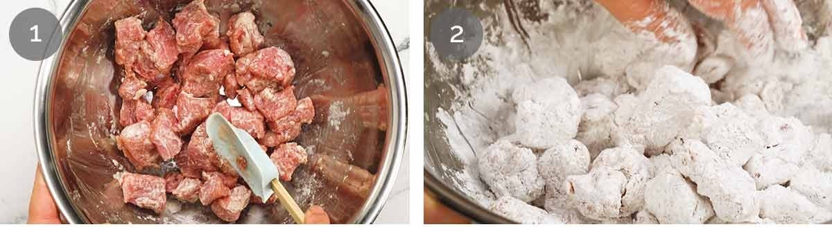 Sticky seasoned pork – Toss the pork in the fish sauce, then add the 1 1/2 tablespoons of cornflour and toss again. You’ll end up with a pale brown milky coating on each piece which is a bit sticky (cornflour does that) and this is what will make the cornflour dusting stick to each piece of pork.