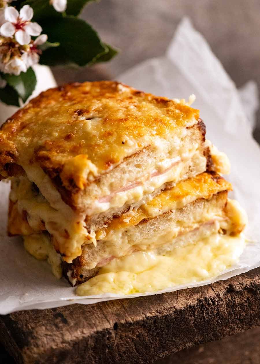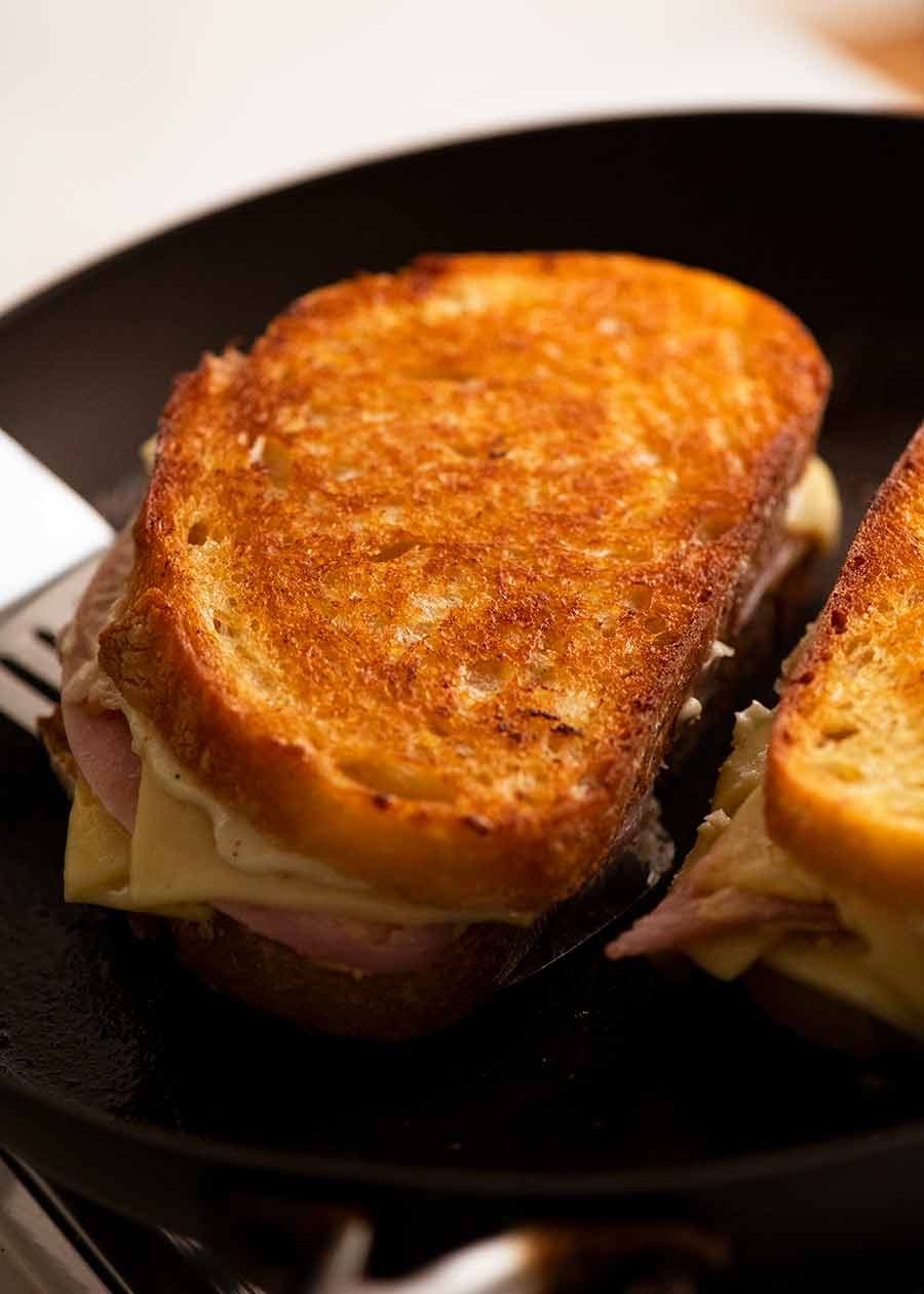 Croque Monsieur is a hot ham and cheese sandwich, done the French way! Béchamel sauce, ham, cheese and a smear of Dijon mustard, grilled until it’s oozing, this sandwich is the king of grilled cheeses!