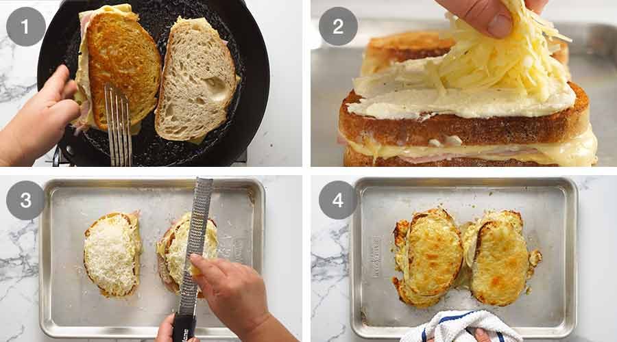 - Topping: Slather remaining béchamel thickly on the upper pieces of bread. Sprinkle with Gruyere, then parmesan.