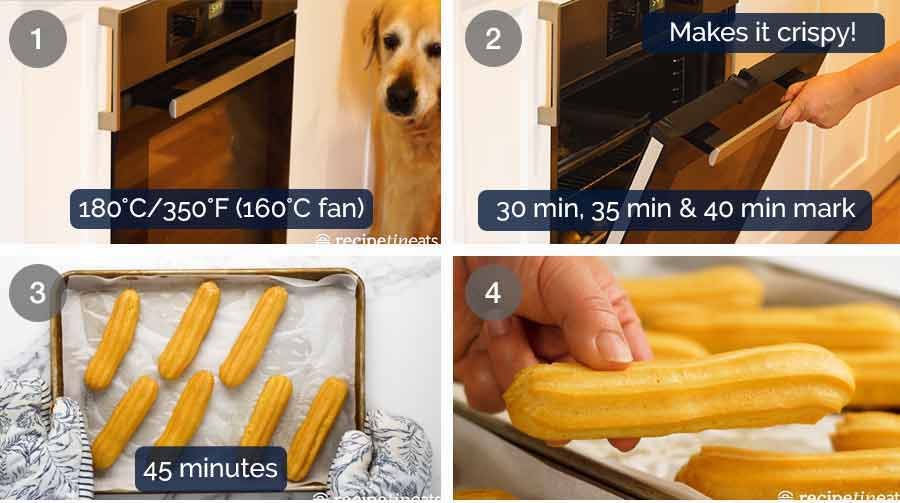 Don’t crowd the tray! Be sure to leave plenty of space – 5cm / 2″ – between the logs. If you crowd the tray, they curiously will not crisp up (as I found out first hand!) because of the steam from surrounding buns. I need to use 3 trays to fit all mine. If you have a big oven and big trays, you might only need 2 trays – lucky you! I pipe on an angle because that’s how I can fit the most on each tray while leaving sufficient space between each log.