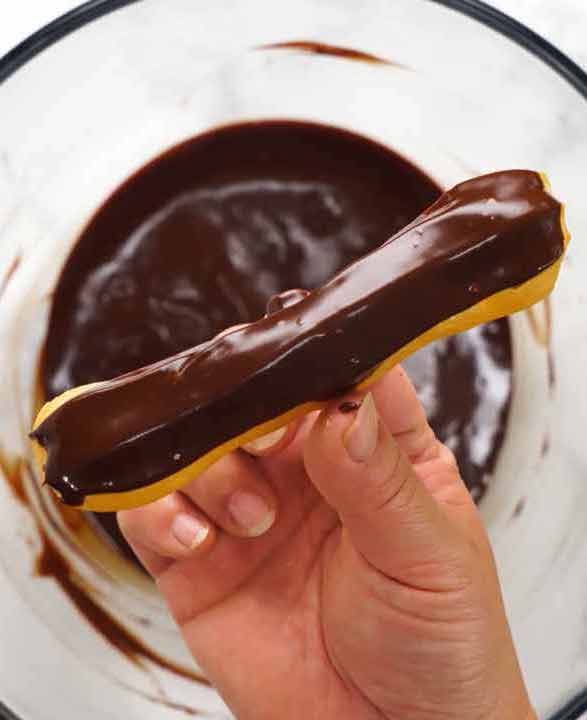 Note: You will have leftover chocolate, because too little glaze makes it hard to dip the eclairs. I don’t think you need my help telling you what to do with the leftovers! (It involves a spoon. And your mouth.)