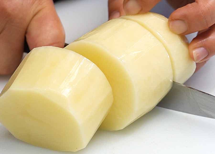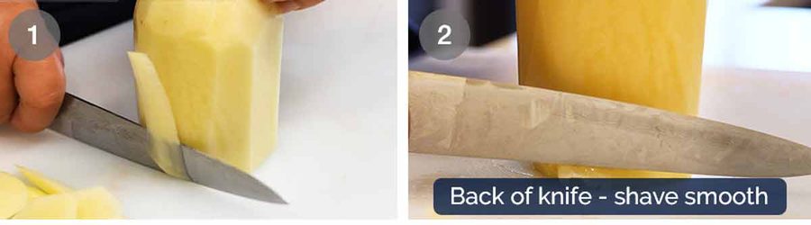 - Pro method – Lie potato on its side and use a knife to carve around to form a cylinder.