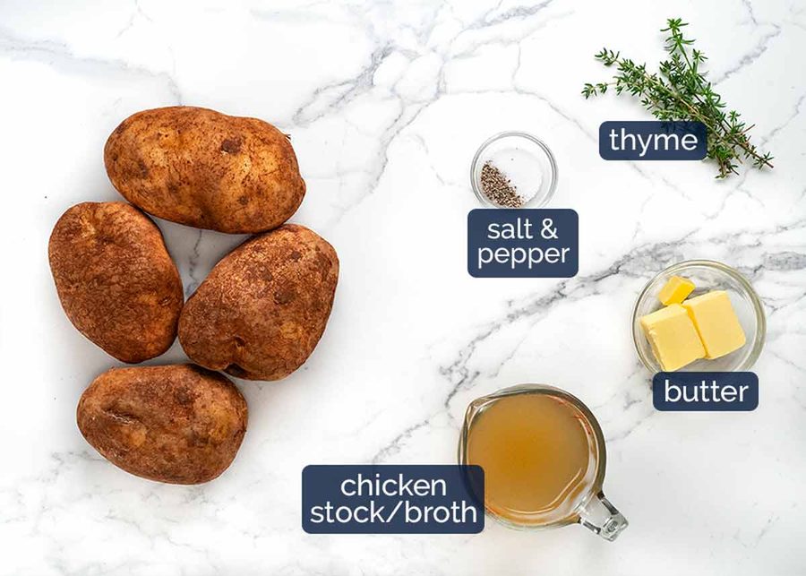 Thyme – Fresh thyme sprigs work best to infuse the butter / stock with flavour. But you can substitute with dried thyme though you will end up with little thyme bits stuck on your potato.