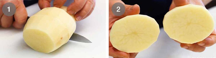 Trim base – For all methods, the first step is to peel the potatoes then trim a bit off the top and bottom so it stands upright. It just makes it easier to handle.