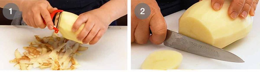 Choose from pro level to easy – or skip it entirely! Just peel potatoes then cut into thick slabs. It will taste just as good!