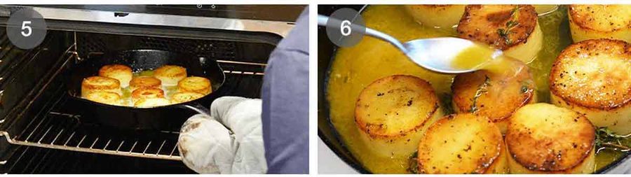 - Sear – In an ovenproof heavy based skillet (Note 2), heat the remaining 1 tbsp oil over medium high heat. Put the potato in and cook each side for 6 – 8 minutes or until golden.