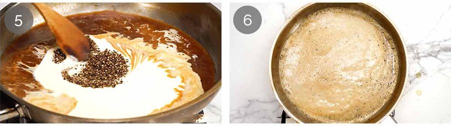 Pour in the beef stock – Return the pan to high heat. Add the beef stock and simmer rapidly for about 4 minutes, until reduced by half.