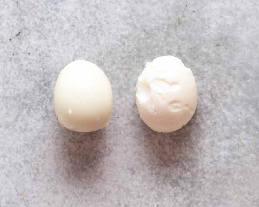 - Peel from base in water – Crack the base of the shell by tapping it on the counter, then peel under water from the base (it's easier).