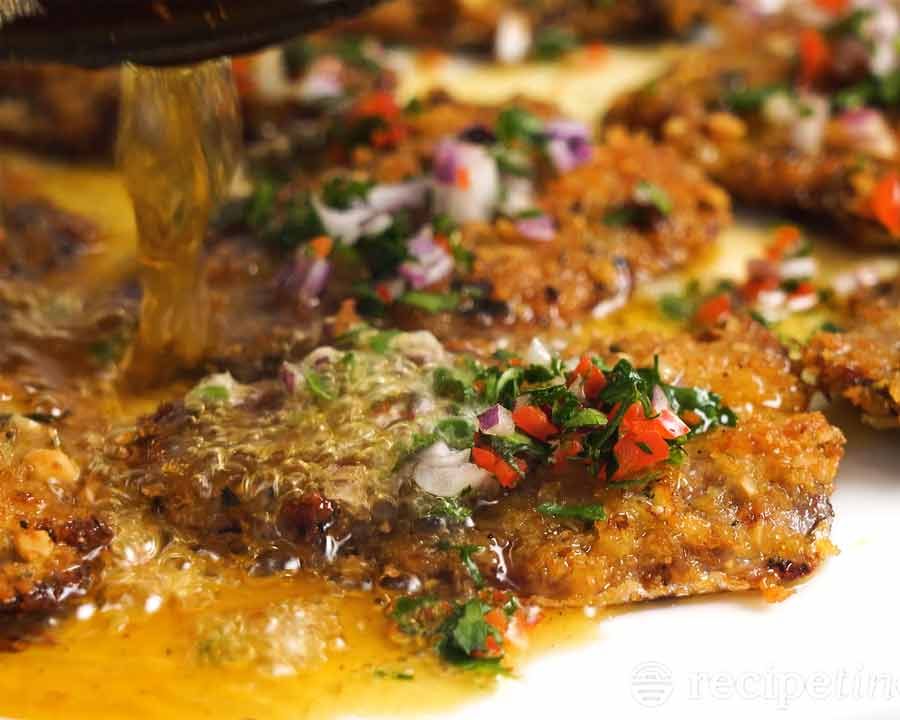 Topping – Remove the sardines to a serving plate, crust side up. Then sprinkle with the Topping (onion, chilli, parsley).