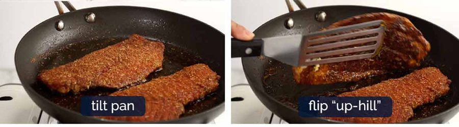- Flip – the spice crust should be a deep bronze colour with a reddish tinge. Cook the other side for 1 minute until the target internal temperature is 55°C/130°F, or the fish flakes easily at the thickest point.